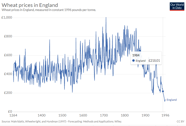 How can I be sure this is going to be affordable? I know most people think life is getting more expensive, but the reality for basic living needs, and when adjusted for inflation, is actually the opposite. You can see it in the long term, inflation-adjusted food prices. Here are wheat prices for the last 800 years in England. Notice what the industrial revolution did: